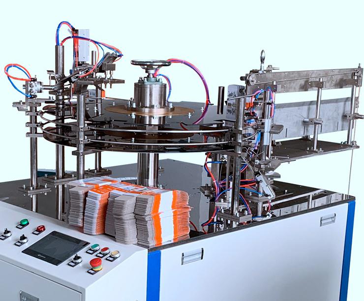 本设备采用变频电机驱动高精度凸轮分割器将工作台面等分成十二工位,首先由真空吸附装置将彩盒从料栈拉进上料工位,然后随着工作台面的旋转,依次在不同工位自动完成彩盒下盖和上盖的折叠合拢工作。在下盖折叠合拢之后,由人工或机械手将产品放入彩盒中,再经过上盖的折叠合拢,通过下料装置将彩盒推出,完成产品的彩盒包装。